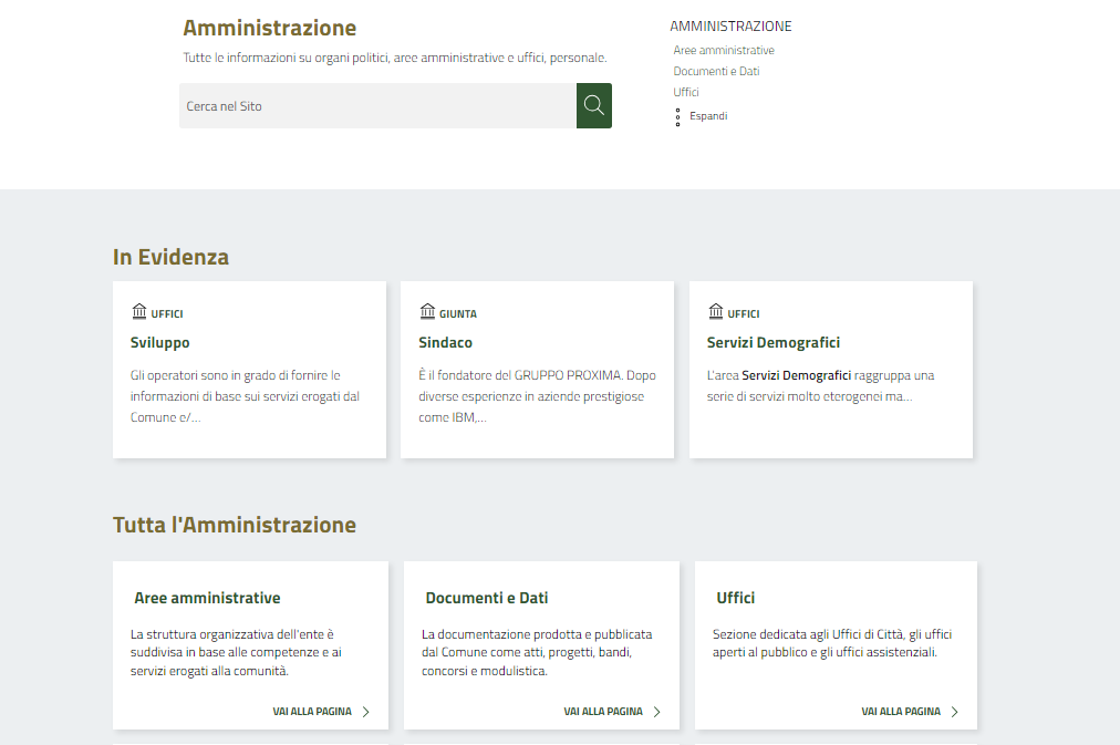 Com'è fatto il sito? Amministrazione Cliccando sul menĂ¹ "Amministrazione" si accede ad una serie di sezioni che raccontano la vita amministrativa del Comune, da un punto di vista politico, tecnico e burocratico.