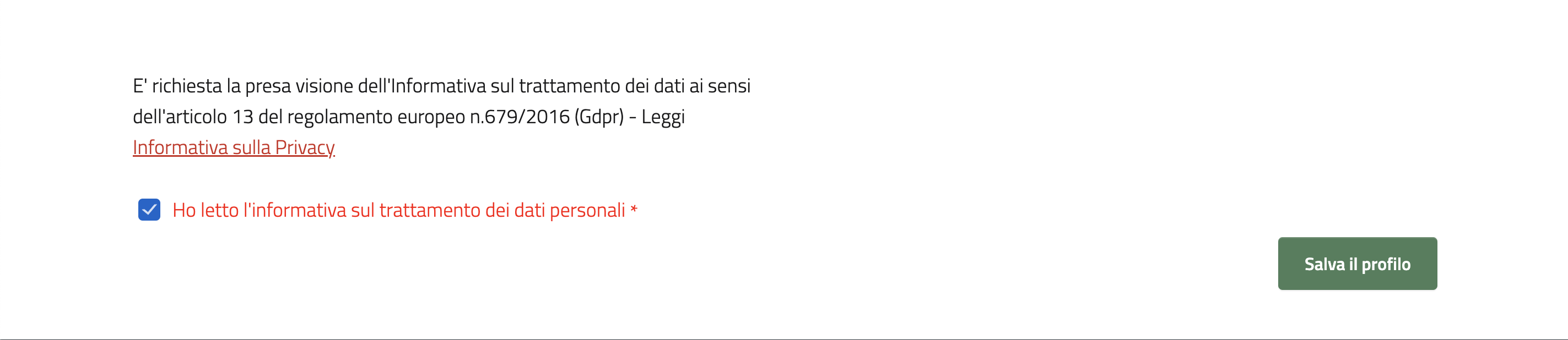 Flaggare Ho letto l'informativa sul trattamento dei dati personali e poi Salva il profilo.