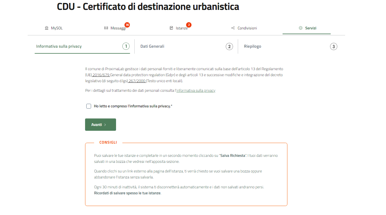 Il primo passo per richiedere il rilascio di certificato di destinazione urbanistica, è l'accettazione dell'informativa privacy.