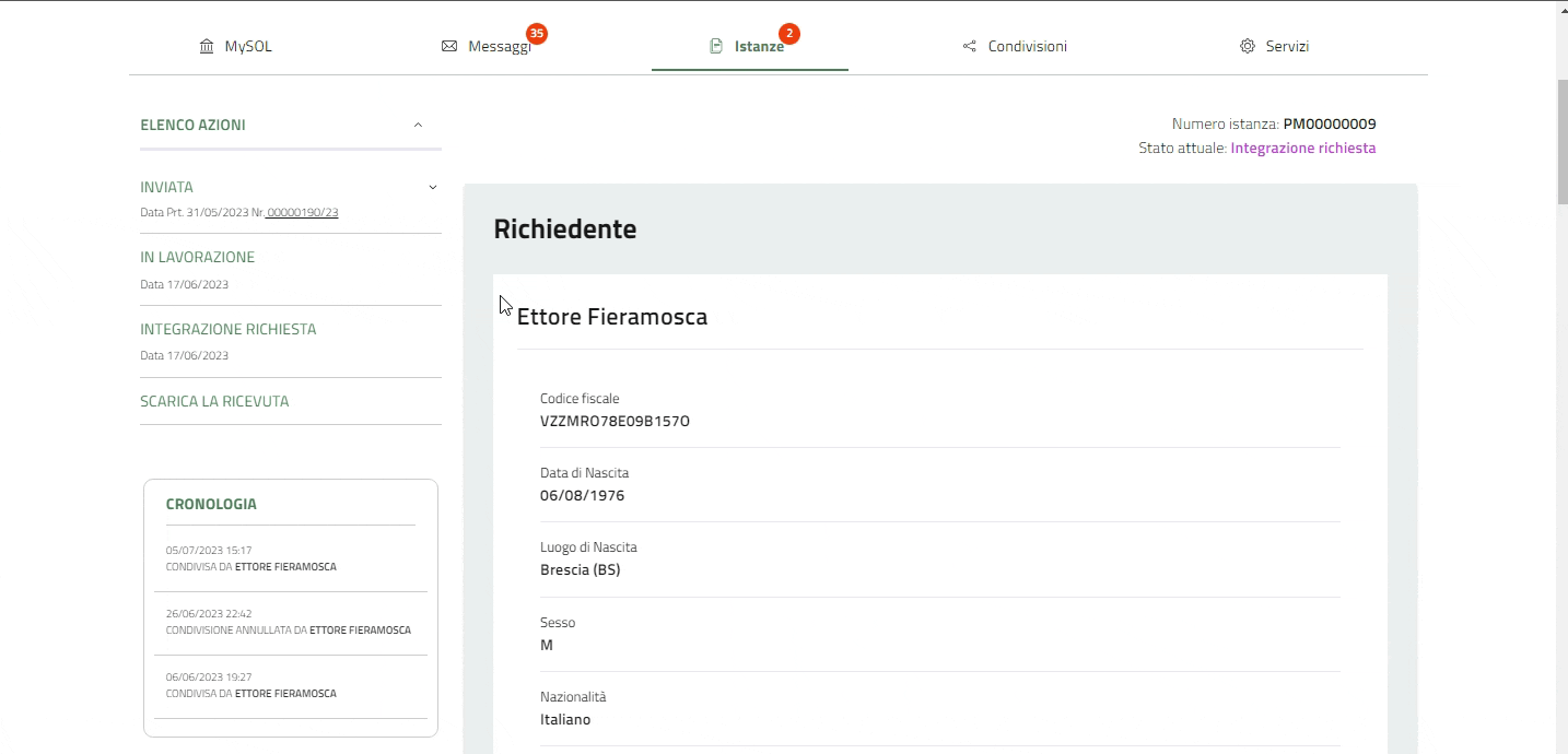 Cliccando su "Consulta" è possibile vedere l'istanza e la cronologia della condivisione, conoscendo lo stato dell'istanza.
