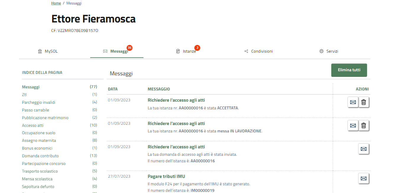 La sezione messaggi raccoglie tute le comunicazioni che l'Amministrazione invia all'utente, anche automatiche, quali l'accettazione o il rifiuto di un'istanza o la generazione di un avviso di pagamento.