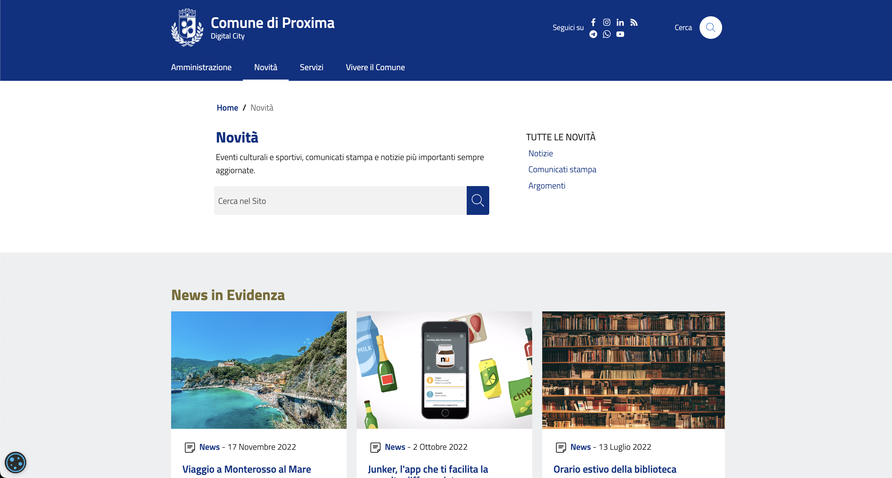 Come suggerisce il nome della sezione, all'interno di questa pagina troverete tutte le novità del Comune, ovvero le news pubblicate, i comunicati stampa e gli argomenti tramite i quali potrete accedere velocemente ai contenuti raccolti per macrocategorie.