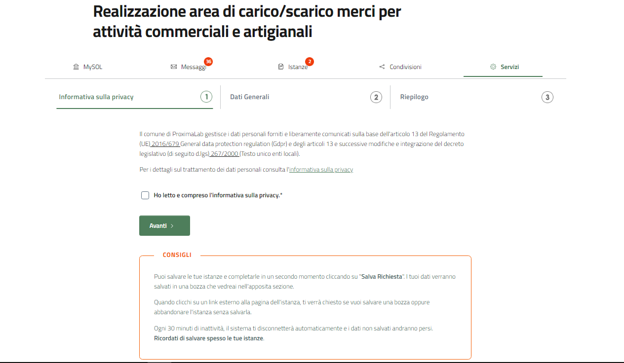 Il primo passo per richiedere la realizzazione di un'area di carico/scarico merci, è l'accettazione dell'informativa privacy.