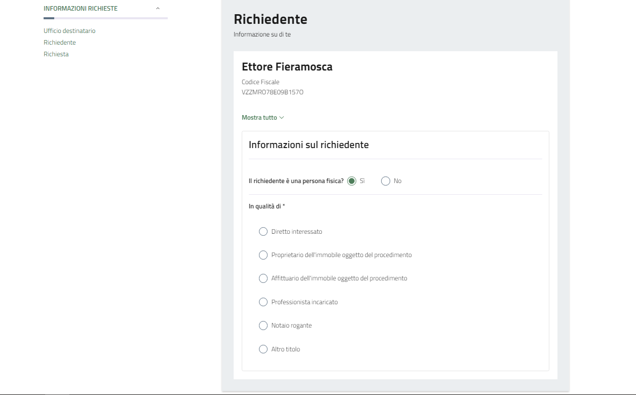 Indicare in base a quale ruolo si effettua la richiesta per capire se si sia diretti interessati oppure se la procedura possa richiedere l'autorizzazione di una controparte.