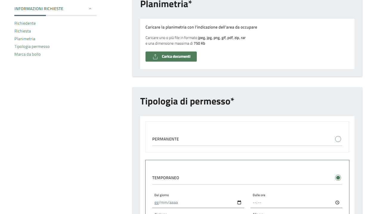 Nel caso in cui il permesso sia temporaneo indicare anche la data e e le ore nelle quali non sia concesso il passaggio.