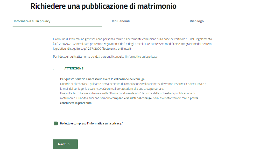 Per questo motivo fin dal primo passaggio, ovvero l'accettazione dell'informativa sulla Privacy, troverete un box dedicato che descriverà la procedura di condivisione dell'istanza.