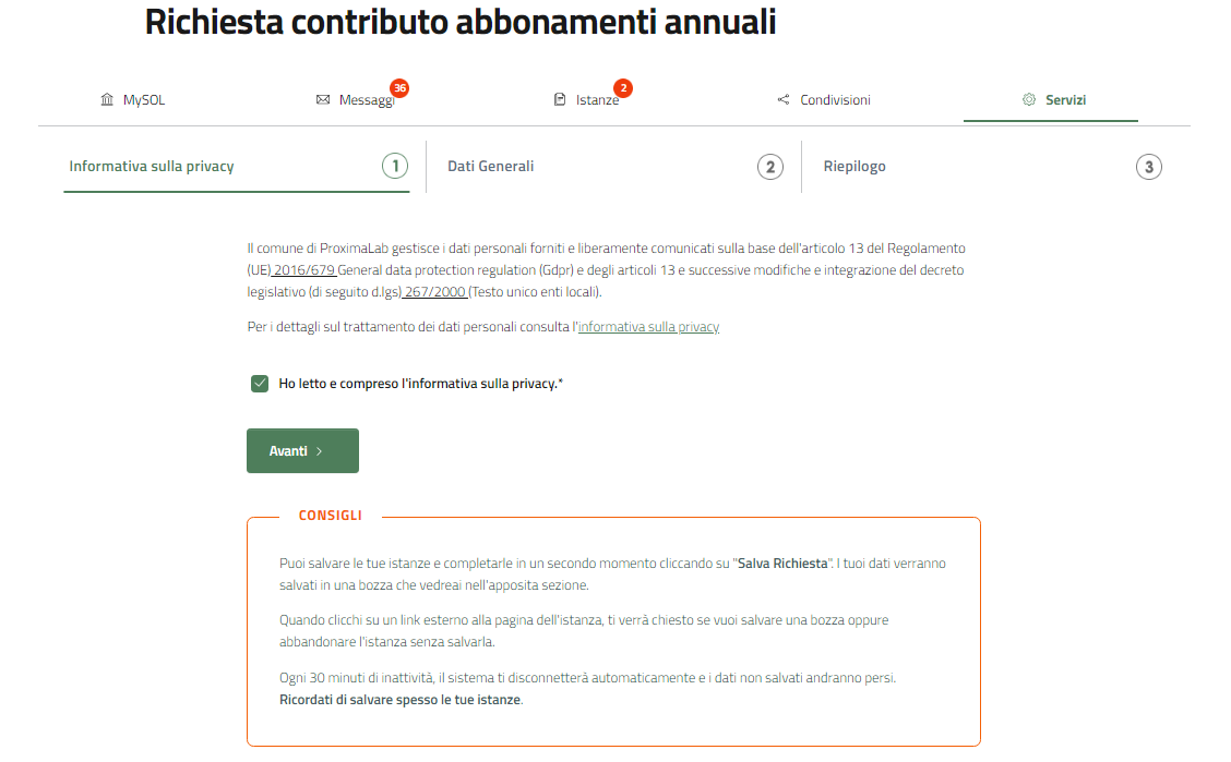 In ogni momento è possibile salvare l'istanza e proseguire la compilazione in un secondo momento.