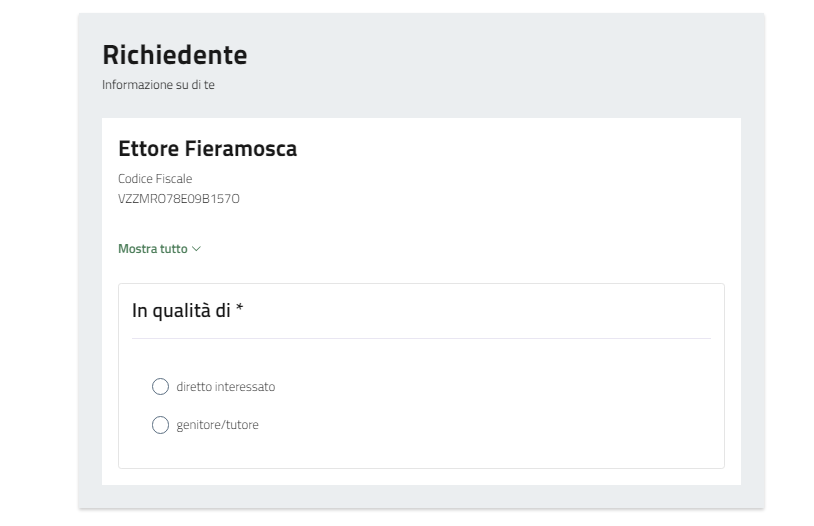 Indicare se presenta la domanda come diretto interessato o a nome di un figlio