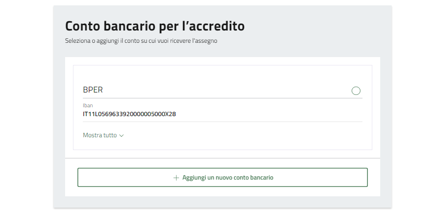 Nel caso in cui si sia inserito nell'anagrafica all'interno dell'area personale i dettagli del conto corrente, comparirà automaticamente per l'accredito.