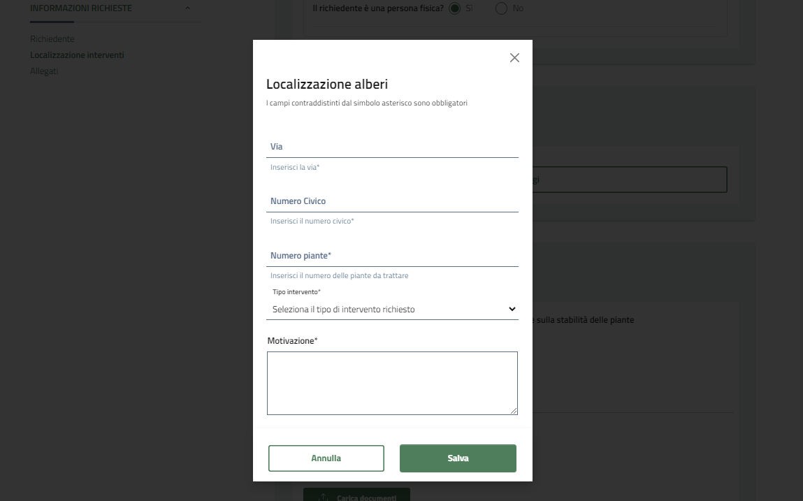 Indicare la via, il civico, il numero di piante e il tipo di intervento, ovvero Abbattimento oppure potatura. Indicare infine la motivazione avvalorata dagli allegati.