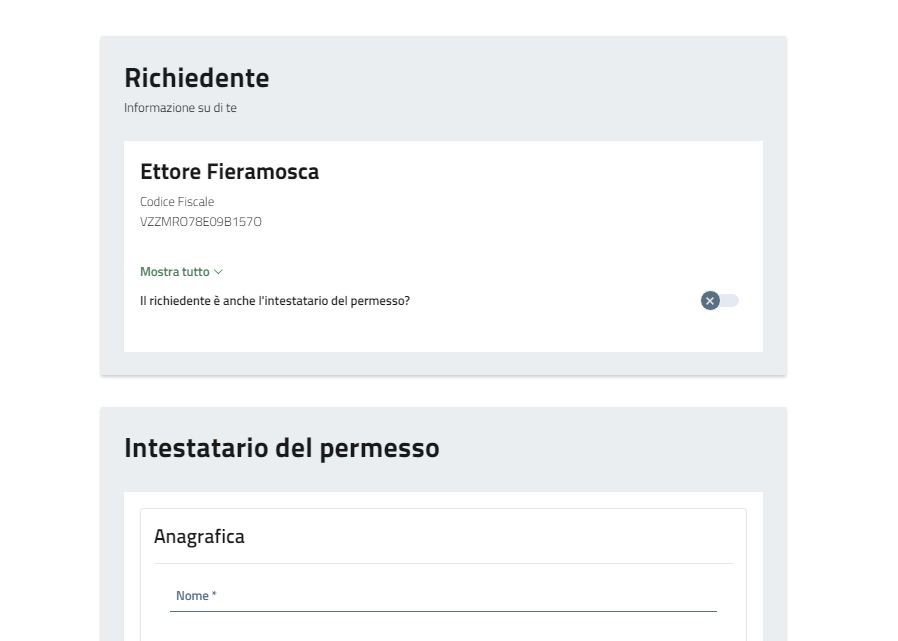 Indicare se il richiedente è anche l'intestatario del permesso. In caso negativo, è necessario compilare l'intera anagrafica dell'intestatario.