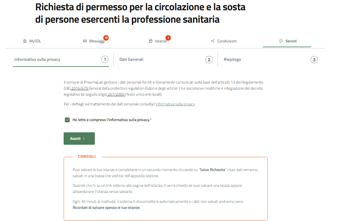 In ogni momento è possibile salvare l'istanza e proseguire la compilazione in un secondo momento.