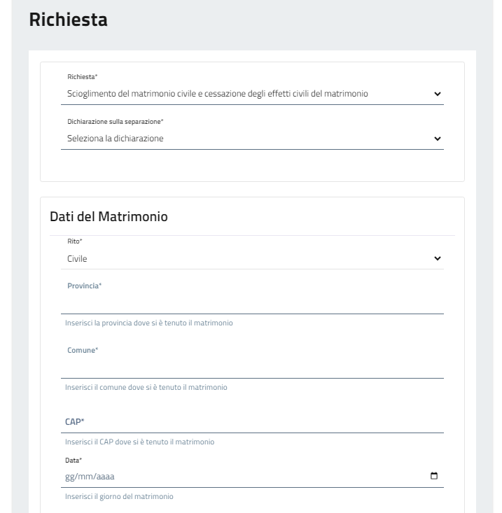 - Scioglimento del matrimonio civile e cessazione degli effetti civili del matrimonio: in questo caso è necessario precisare la dichiarazione sulla separazione