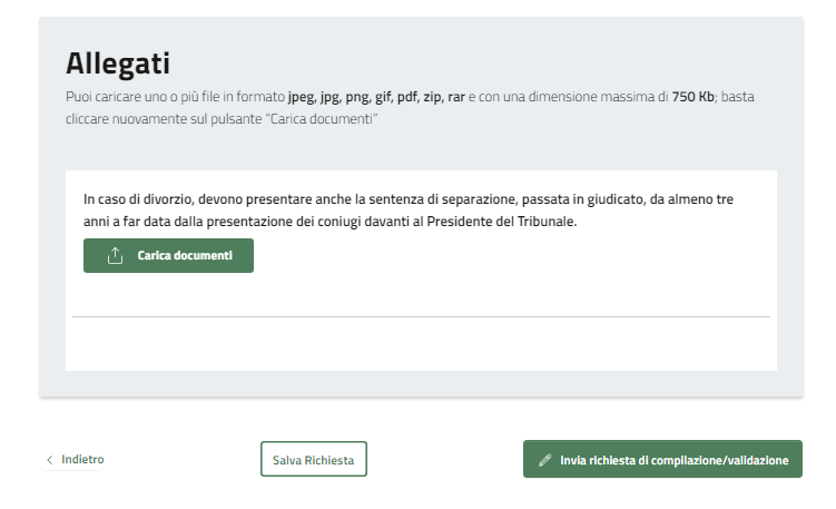 - Modifica degli accordi di separazione e divorzio già stipulati: in questo caso è necessario caricare l'allegato contenente il precedente accordo